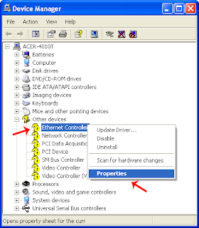 3. Setelah Device Manager terbuka, pilih salah satu driver yg belum terpasang, yaitu ditandai dengan tanda tanya kuning. Kemudian klik kanan pada salah satunya misalkan Ethernet Controller (Lan Card) pilih Properties.